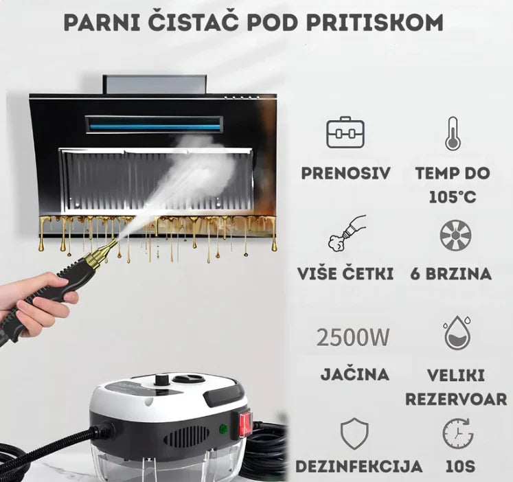 💨 Snažna para pod pritiskom – uklanja masnoću, mrlje, buđ i kamenac.